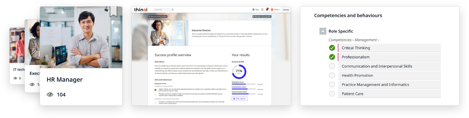 Success profiles in Thinqi allow you to align core competencies in your organisation with individual job roles. This allows you to paint a clear picture of exactly what people need to work on to achieve success in the role they aspire to.